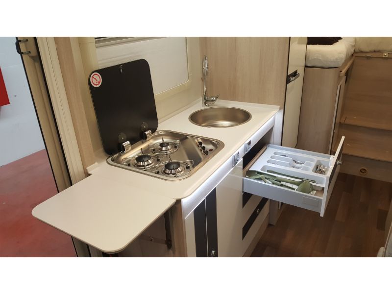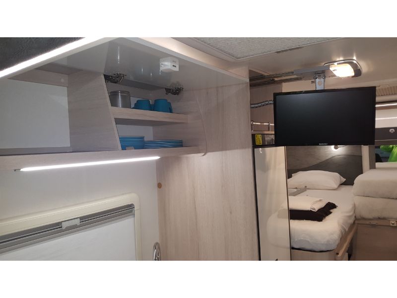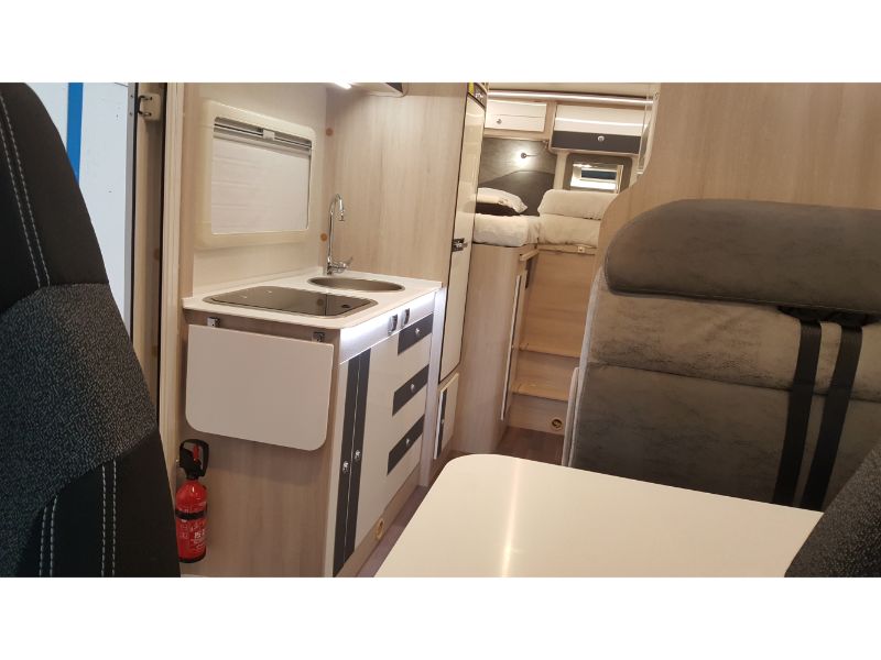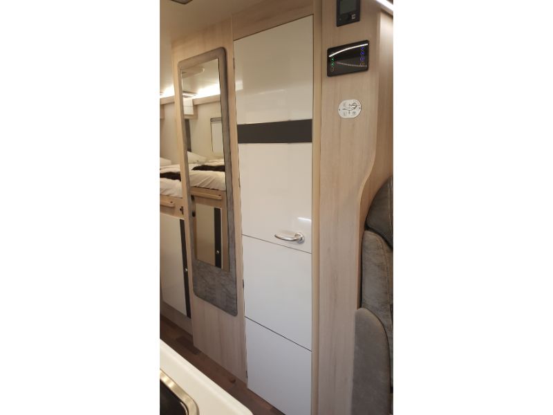 • Color de la madera en roble claro. Puertas de altillo: blanco alto brillo combinado y conjuntado con color grafito. ¡Posibilidad de personalizar el interior de tu autocaravana Ilusion! (Chocolate y Sahara en opción)